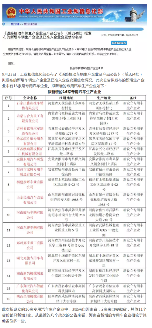 第324批公告擬發布新增16家專用車生產企業