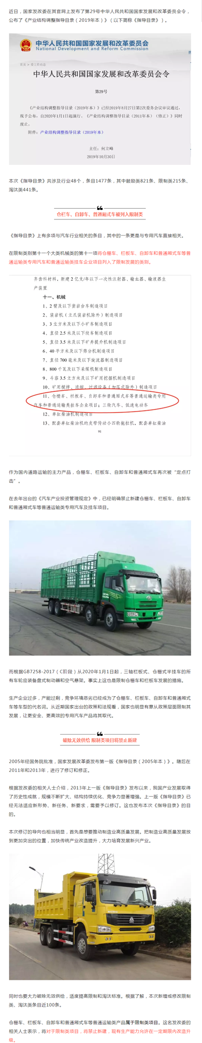 發(fā)改委29號(hào)令將倉(cāng)欄車自卸車等列入限制類