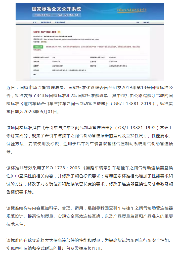 國家標準《道路車輛牽引車與掛車之間氣制動管連接器》發布
